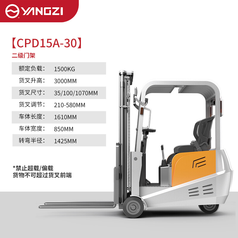 揚子三支點座駕式平衡重電動叉車CPD-A,動力強能耗低免維護低噪音,車身小巧/全車LED警示燈/制動雙保險